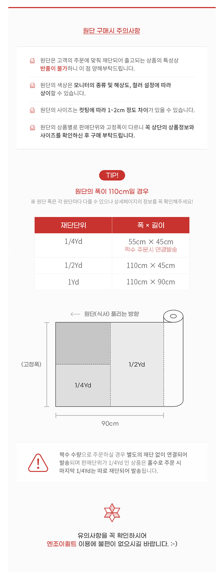 ※홀수로 주문시 1/4yd 조각이 따로 재단되어 나가니 주문시 꼭 참고해주세요.