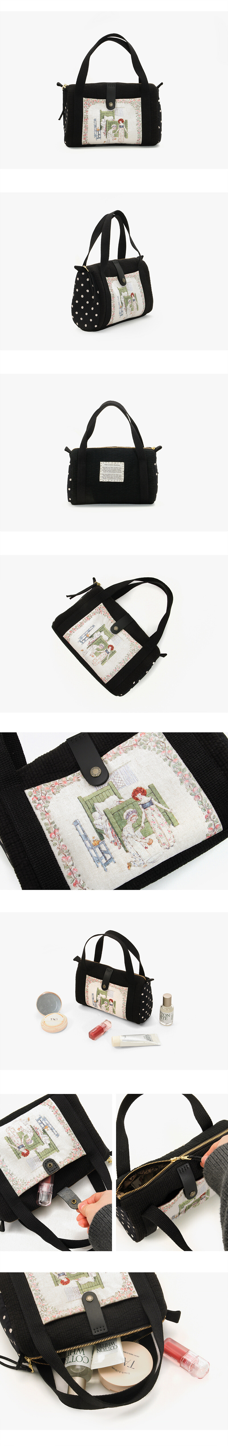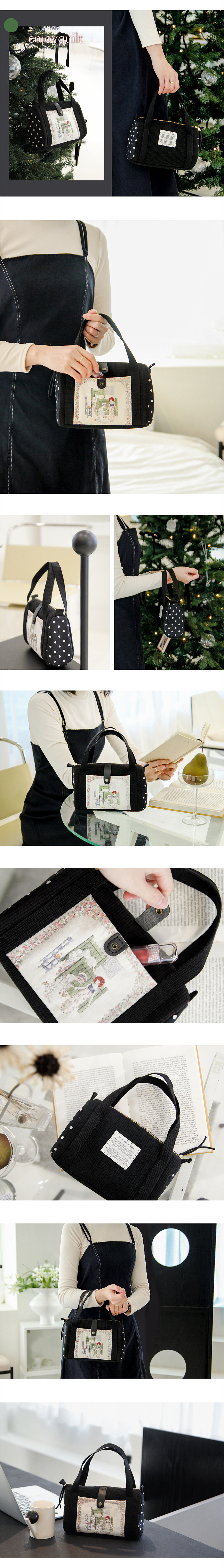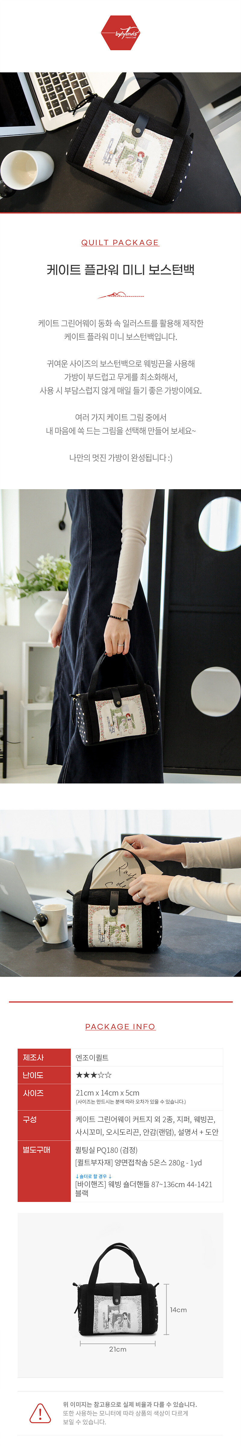 바이핸즈, 엔조이퀼트 퀼트 가방 DIY 패키지입니다. 본 상품은 완제품이 아니라 직접 만들어야 하는 퀼트 패키지이며, 완성 기준 사이즈는 26cm x 17cm x 10cm(약간 오차 가능)로 안내되어 있습니다. 구성품은 케이트 그린어웨이 커트지 외 8종, 수실, 레이스, 면끈, 핸들, 안감(랜덤), 설명서+도안 포함으로 제공됩니다. 아래 상세 이미지를 통해 완성 예시, 사이즈와 구성 안내를 확인하신 후 제작에 참고해 주세요.