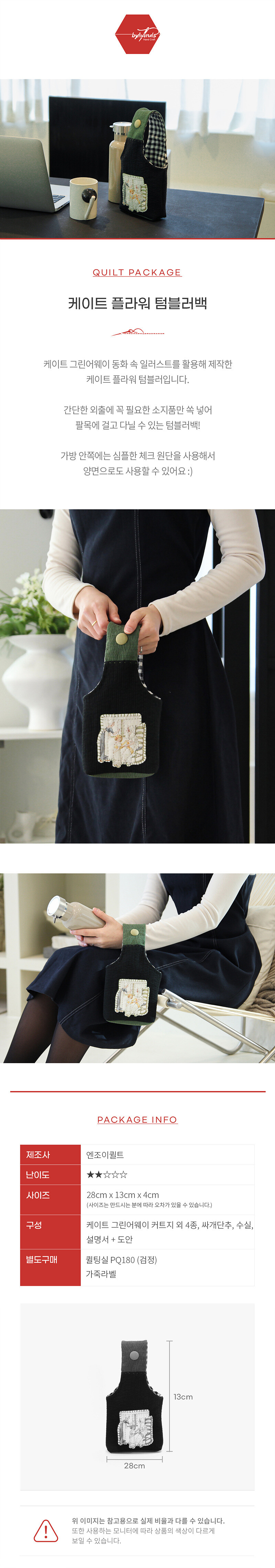 바이핸즈, 엔조이퀼트 퀼트 가방 DIY 패키지입니다. 본 상품은 완제품이 아니라 직접 만들어야 하는 퀼트 패키지이며, 완성 기준 사이즈는 26cm x 17cm x 10cm(약간 오차 가능)로 안내되어 있습니다. 구성품은 케이트 그린어웨이 커트지 외 8종, 수실, 레이스, 면끈, 핸들, 안감(랜덤), 설명서+도안 포함으로 제공됩니다. 아래 상세 이미지를 통해 완성 예시, 사이즈와 구성 안내를 확인하신 후 제작에 참고해 주세요.