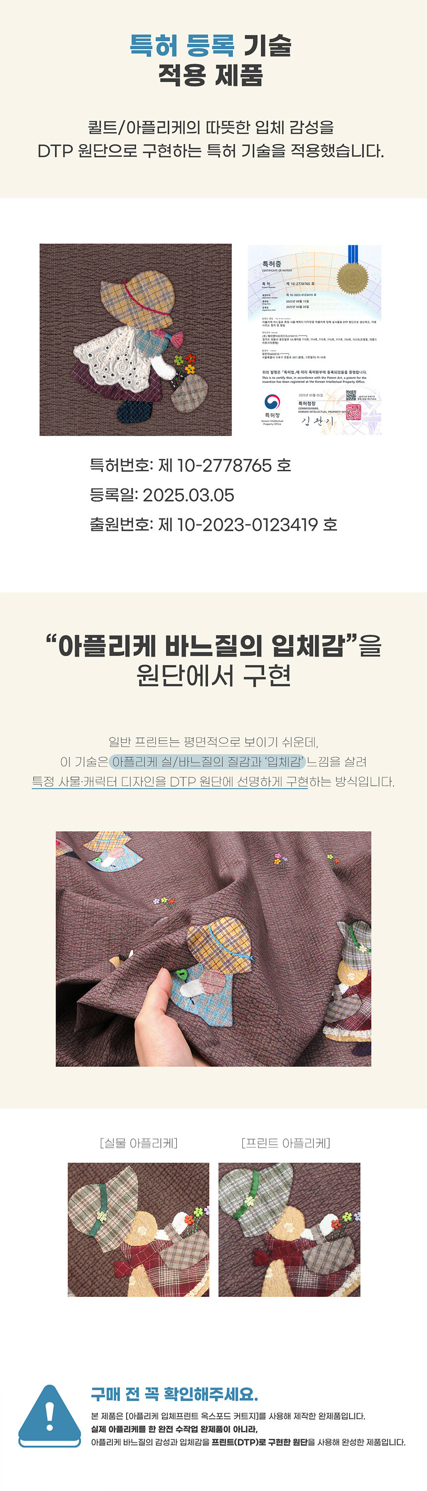 실제 아플리케를 한 완전 수작업 완제품이 아니라, 아플리케 바느질의 감성과 입체감을 프린트(DTP)로 구현한 원단을 사용해 완성한 제품입니다.