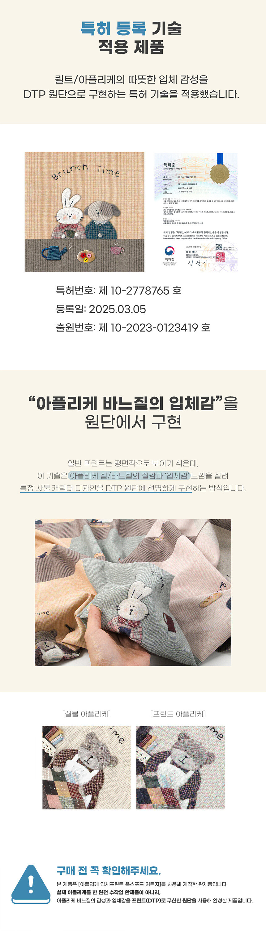 실제 아플리케를 한 완전 수작업 완제품이 아니라, 아플리케 바느질의 감성과 입체감을 프린트(DTP)로 구현한 원단을 사용해 완성한 제품입니다.